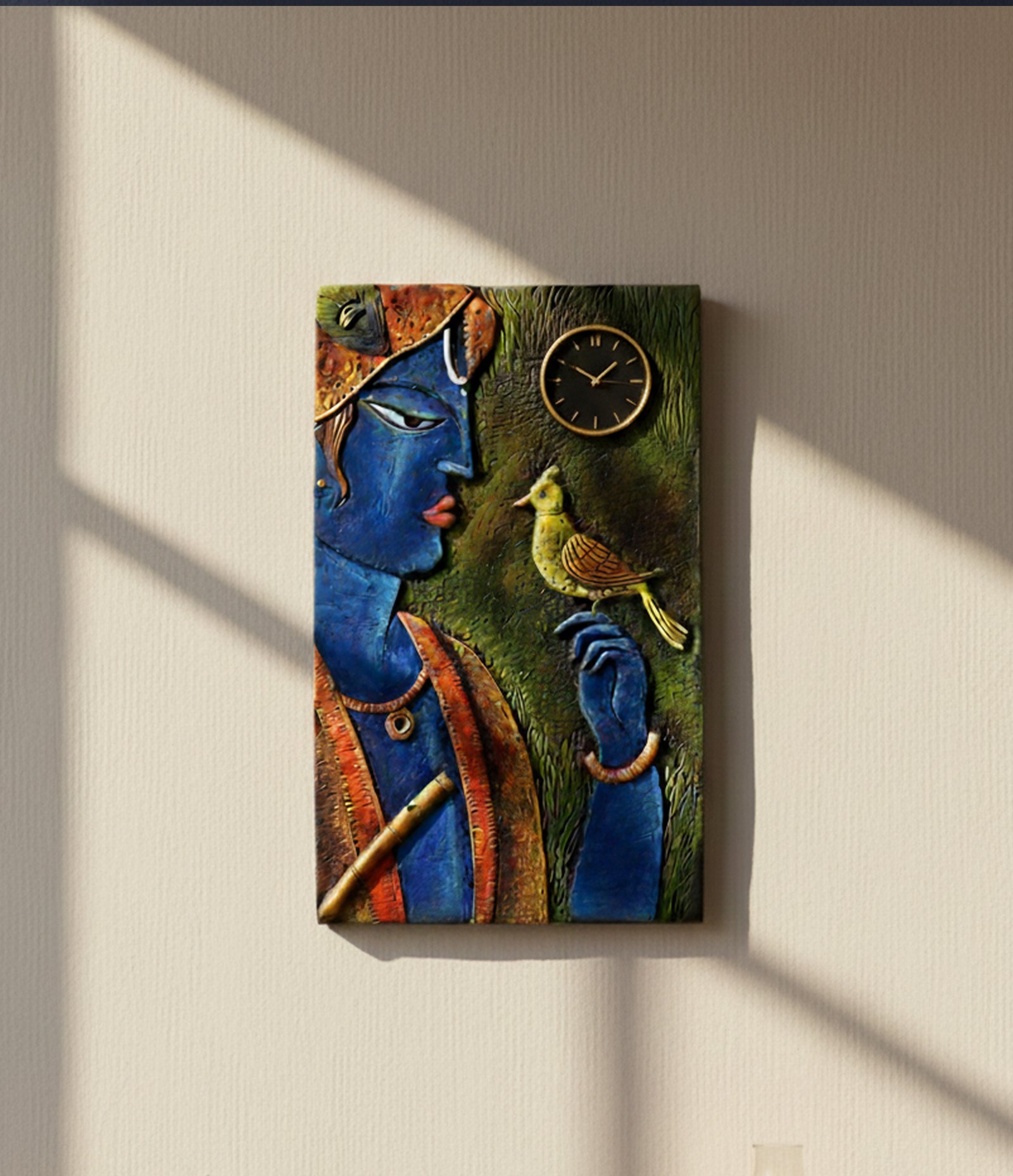 Lord Krishna, draped in vibrant saffron and earth-toned silks, pauses in his walk. He has tucked his golden flute away, for today, he is the listener. A small, golden-yellow songbird has fluttered down from the kadamba trees, landing fearlessly upon his finger. In this quiet exchange, the bird shares the secrets of the forest—the coming of the rains and the blooming of the hidden lotuses.