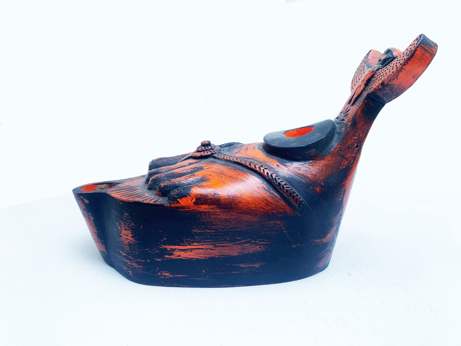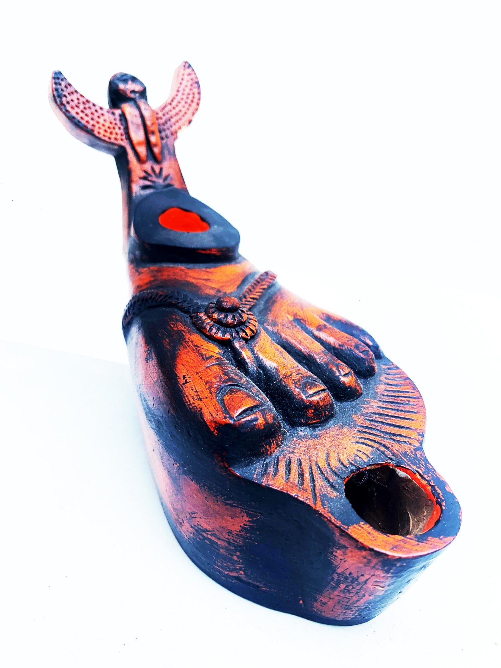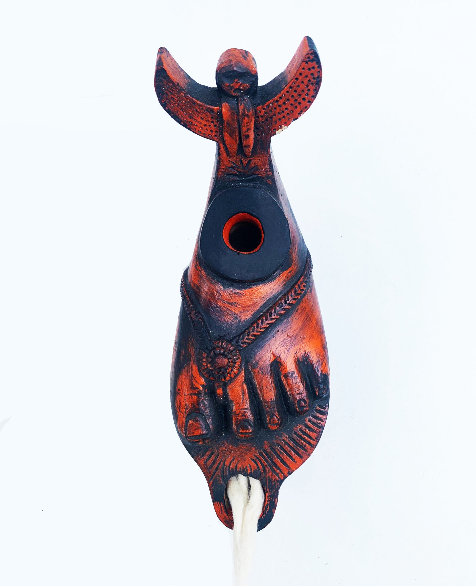 Artificial Lighting was common in the Roman world and fired clay was the most used material. These lamps were fueled with olive oil and other vegetable oils. This piece of oil lamp is a resemblance of a fine piece of Roman sculpture depicting a sandaled foot, with a sphinx or siren forming the handle.