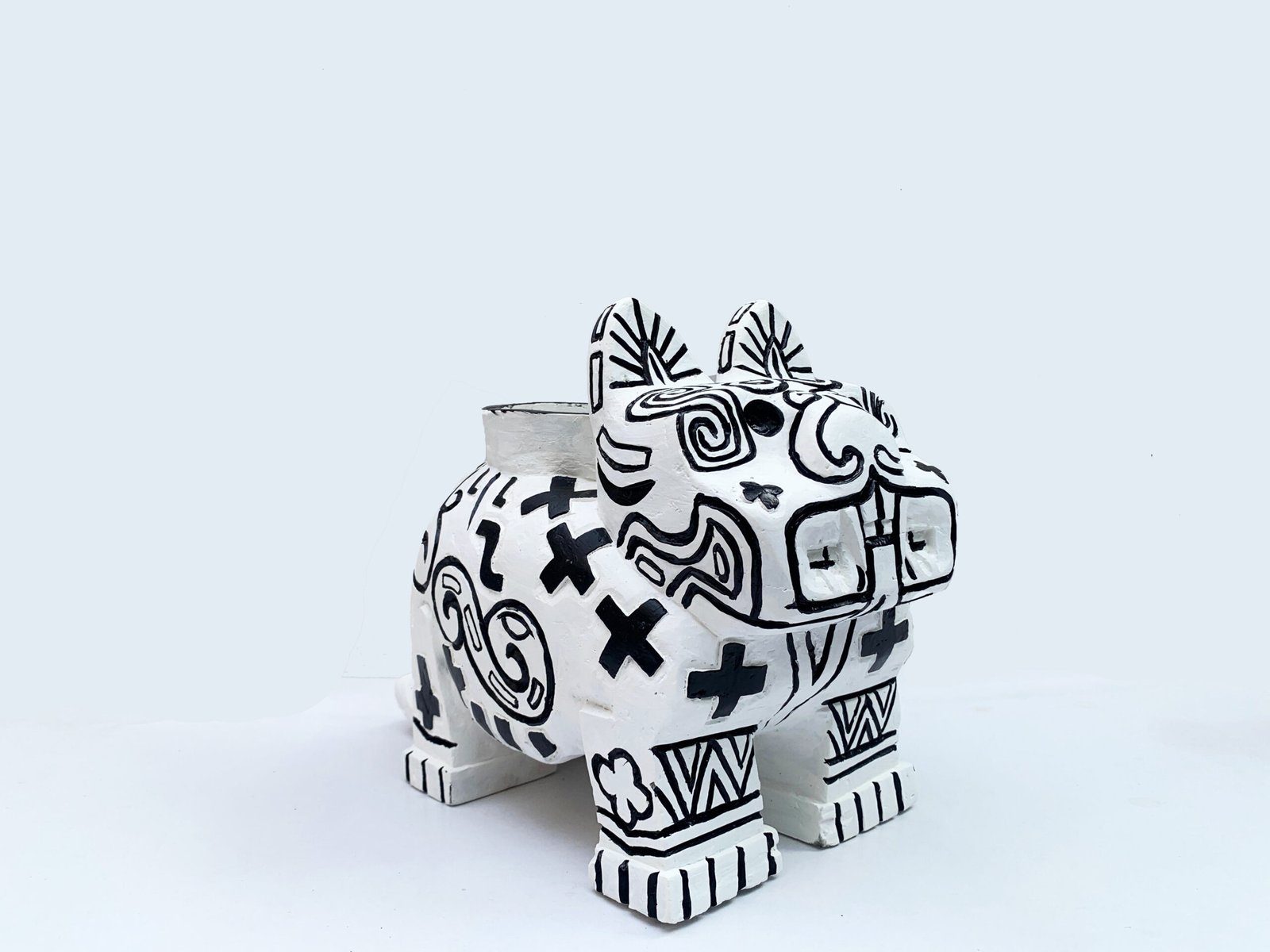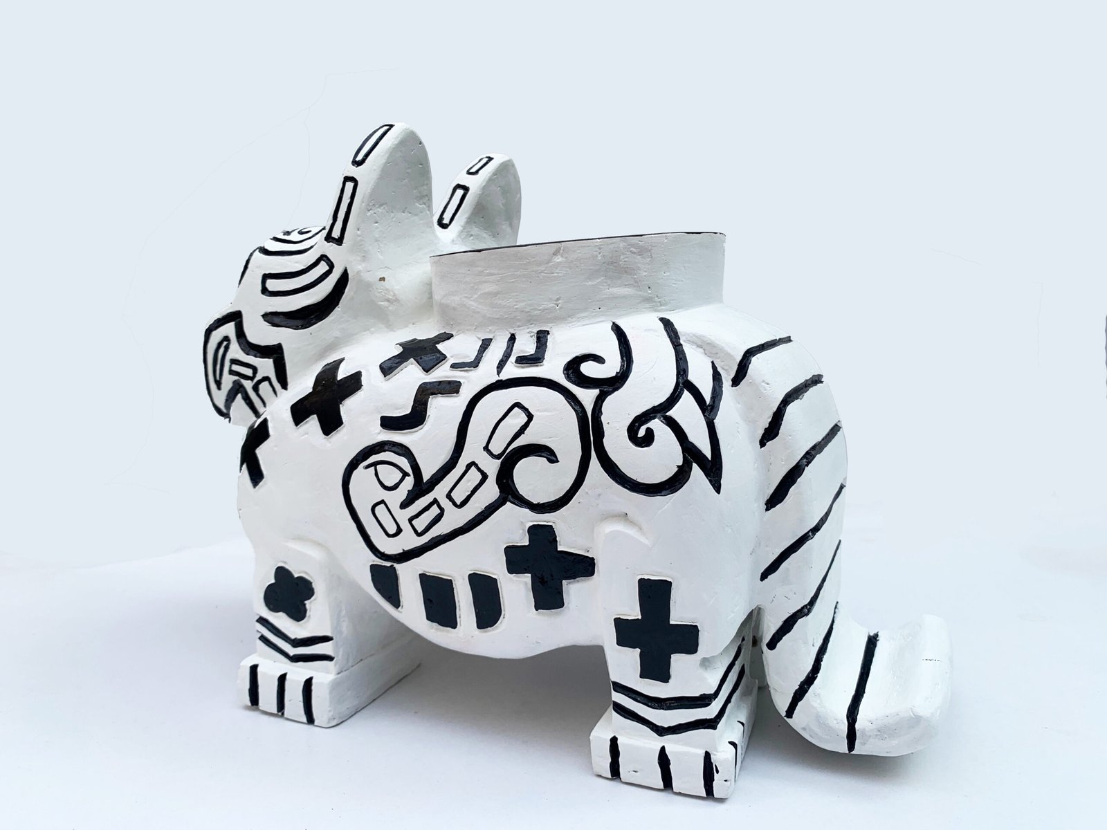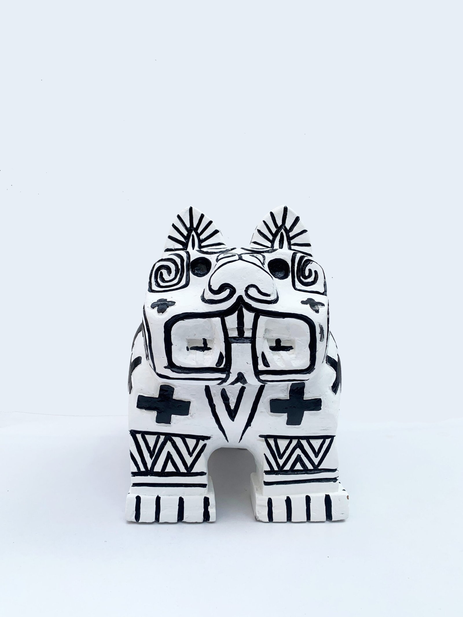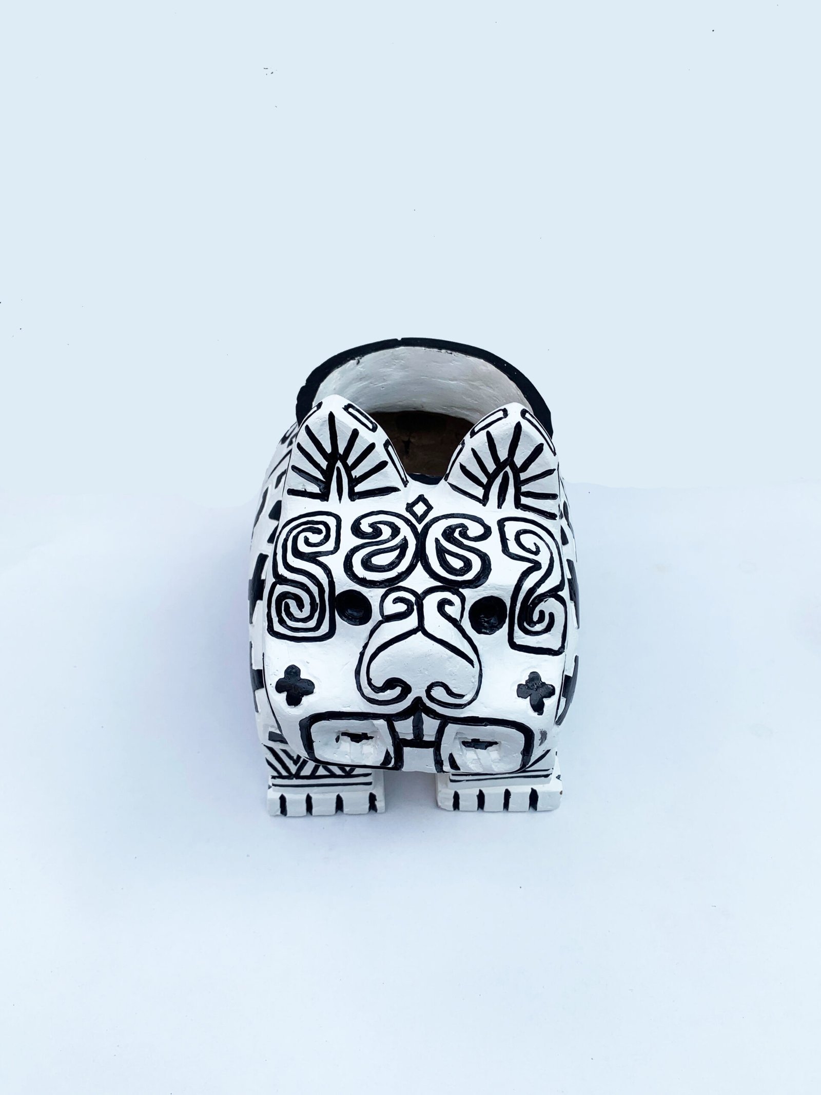 This awesome terracotta sculpture is a look alike of a fierce feline puma baring its canines and bearing in its back a deep conical cup. Â The effigy vessel is highly conventionalized, symmetrical and perfectly finished, incised with decorative geometric motifs all over the body. The body is ponderous and the legs are short. The feet are rectangular blocks with broad flat bases. Chavin shamans or priests likely used to prepare hallucinogenic snuff for religious ceremonies, along with stone utensils like these.